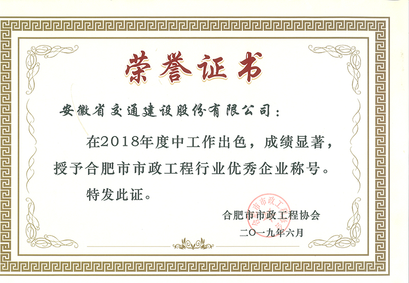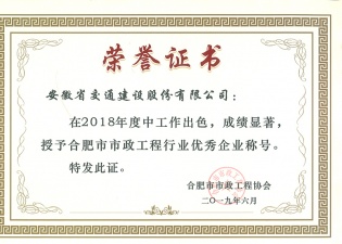合肥市市政工程行業(yè)優(yōu)秀企業(yè)稱(chēng)號(hào)